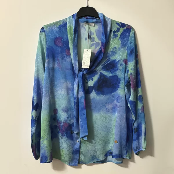 Blusa em tecido estampada fino com manga comprida com elástico no punho. Decote com laço tipo cachecol com laçada.