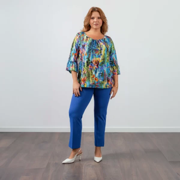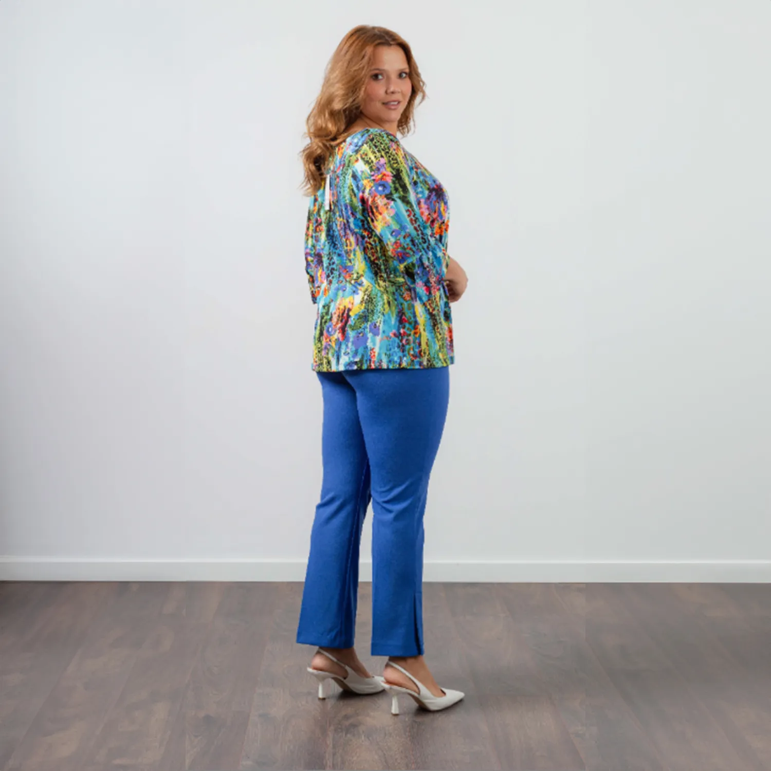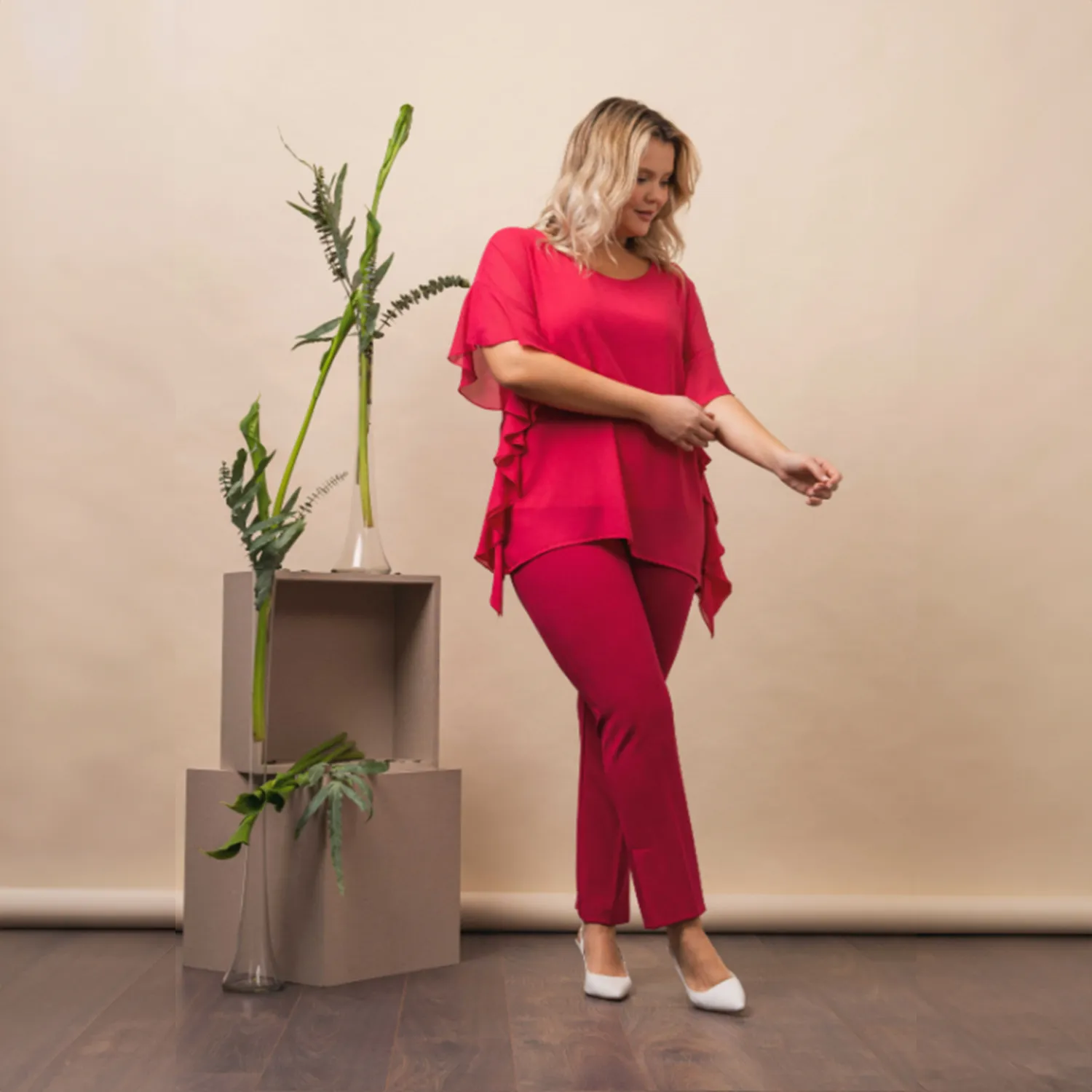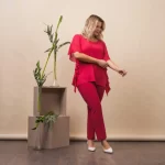 Calças em malha crepe lisa com elástico na cintura e racha nas laterais.