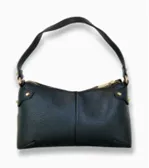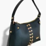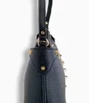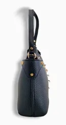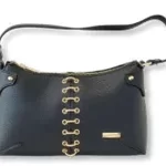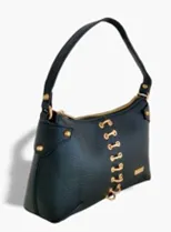 Mala de senhora de pele sintética, decorada na frente com argolas douradas dispostas em filas verticais . Alças mais alça a tiracolo. Fechos de correr e interior amplo com bolsos laterais. Forro personalizados da PRIMADONA.