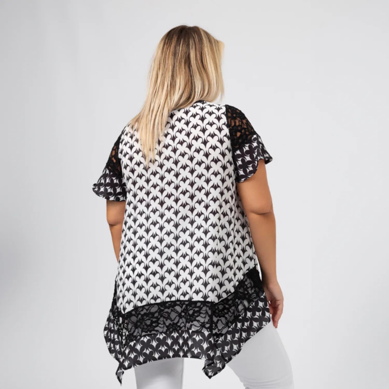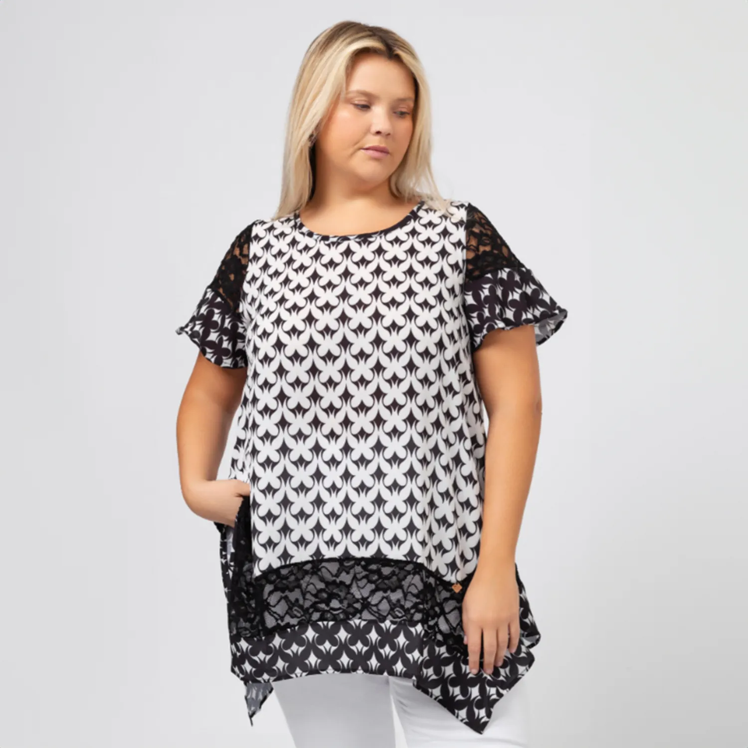 Túnica em tecido estampado, positivo, negativo, manga curta com renda e folho. Renda na base, modelo evasé.